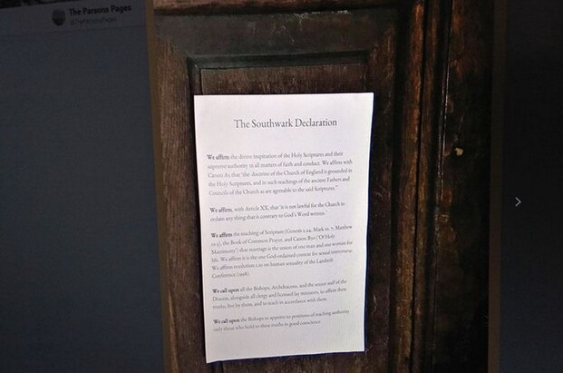 Британське духовенство, на знак протесту проти ліберальної політики Англіканської церкви, вивішує на дверях соборів листівки з «декларацією», в яких повідомляється, що Церква «корумпована» і «перебуває в кризі» через м'яку позицію з приводу одностатевих відносин, пише Christiantoday.