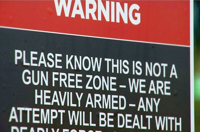 «Будь ласка, знайте, що це не зона, вільна від зброї. Ми важко озброєні – будь-яка спроба (нападу – RT) матиме справу зі смертоносним опором. Так, ми церква і будемо захищати наших людей», – зазначено на табличці. Повідомлення підписано – «пастори».