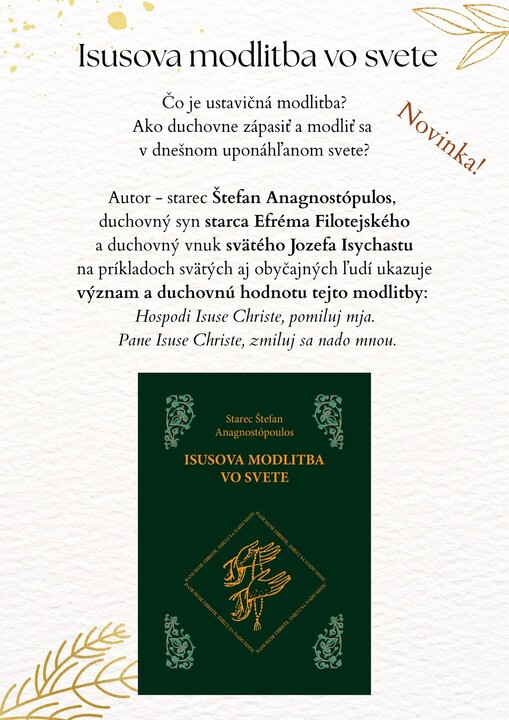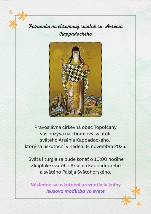Dnes, 9. novembra 2025, sa v Pravoslávnej cirkevnej obci v Topoľčanoch uskutoční slávnostná prezentácia duchovnej knihy Isusova modlitba vo svete od starca Štefana Anagnostópula. Udalosť sa koná po svätej liturgii pri príležitosti chrámového sviatku svätého Arsénia Kappadockého, informuje o tom FB stránka Pravoslávie Slovensko.