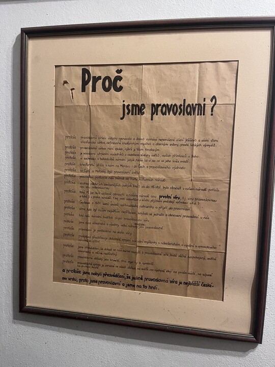 Na přednášce otce Metoděje v pražské katedrále jsem si všiml jednoho mimořádně zajímavého dokumentu - starého plakátu z období první republiky s názvem „Proč jsme pravoslavní?“. Visí u zadního vchodu do katedrály sv. Cyrila a Metoděje a obsahuje výčet důvodů, které tehdejší česká pravoslavná komunita považovala za zásadní pro svou víru.