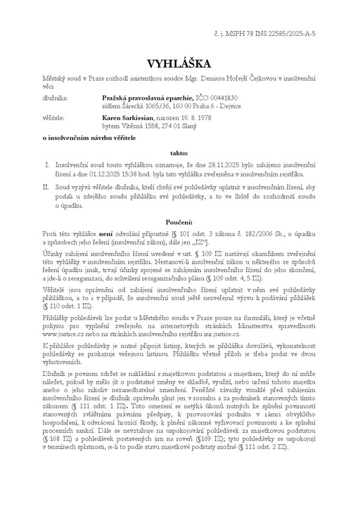 Městský soud v Praze zveřejnil vyhlášku, která potvrzuje zahájení insolvenčního řízení s Pražskou eparchií. Dokument ukončuje týdny spekulací: insolvence eparchie je nyní oficiální a její finanční situaci přebírá soud.