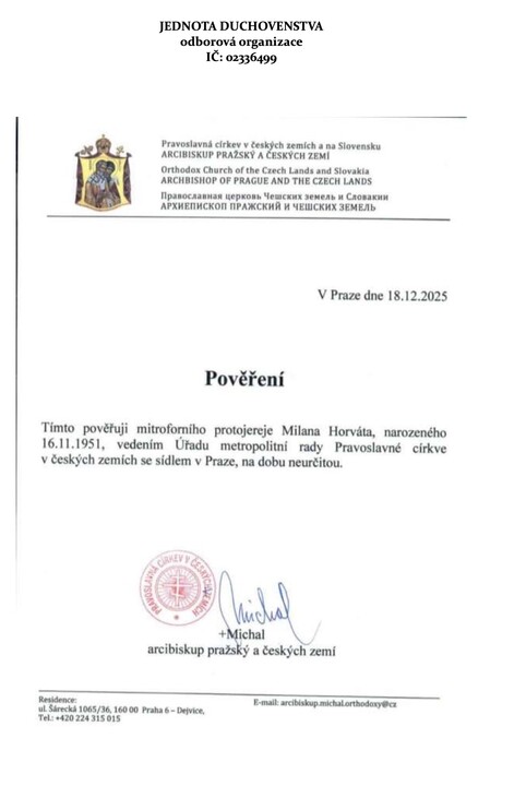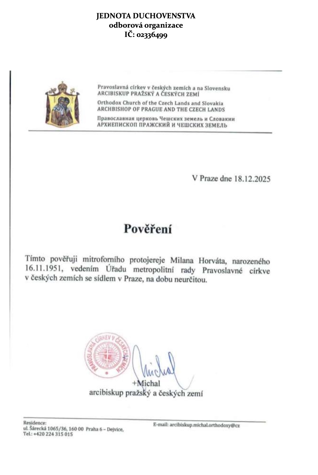 Naše redakce obdržela dokument s názvem "Pověření", podle něhož byl mitroforní protojerej Milan Horvát dne 18. prosince 2025 pověřen vedením Úřadu Metropolitní rady Pravoslavné církve v českých zemích na dobu neurčitou. Pověření vydal arcibiskup pražský a českých zemí Michal.
