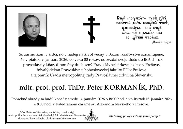V katedrálnom chráme sv. Alexandra Nevského v Prešove sa v uplynulých dňoch uskutočnilo rozlúčenie s mitr. prot. prof. ThDr. Petrom Kormaníkom, PhD., ktorý zosnul 9. januára 2026 vo veku 80 rokov. O priebehu pohrebných obradov informovala Pravoslávna cirkevná obec Prešov na svojom facebookovom profile.