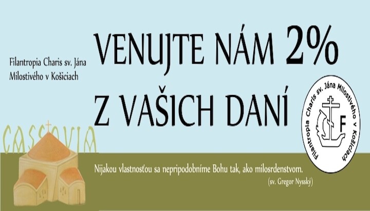 Filantropia Charis sv. Jána Milostivého v Košiciach aj v tomto roku vyzýva verejnosť, aby jej činnosť podporila darovaním 2 % zo zaplatenej dane. Táto forma pomoci nepredstavuje pre darcov žiadne dodatočné finančné náklady, keďže ide o časť dane, ktorá by inak smerovala do štátneho rozpočtu, informuje facebooková stránka Pravoslávna cirkevná obec v Košiciach.