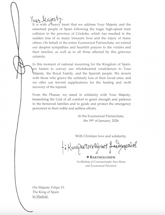 Ekumenický patriarcha Bartoloměj, zaslal oficiální patriarchální list Jeho Veličenstvu španělskému králi Filipu VI., v němž vyjadřuje upřímnou soustrast Ekumenického trůnu i osobní soustrast obětem tragického železničního neštěstí, k němuž došlo v provincii Córdoba, informuje Orthodoxia News Agency.