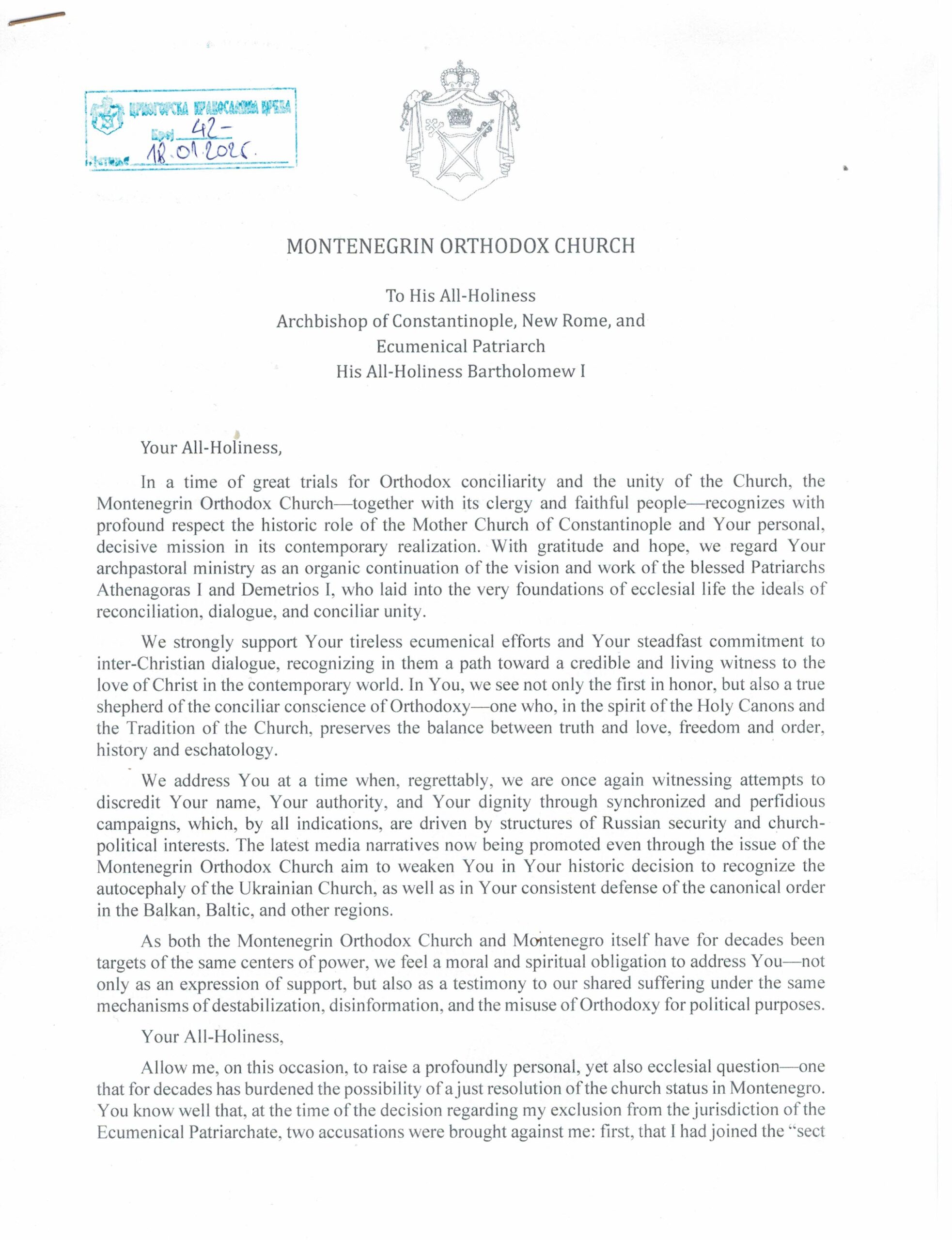 V dopise ekumenickému patriarchovi vyzývá k přezkoumání své kanonické situace a otevření debaty o postavení schizmatické "Pravoslavné církve Černé Hory".