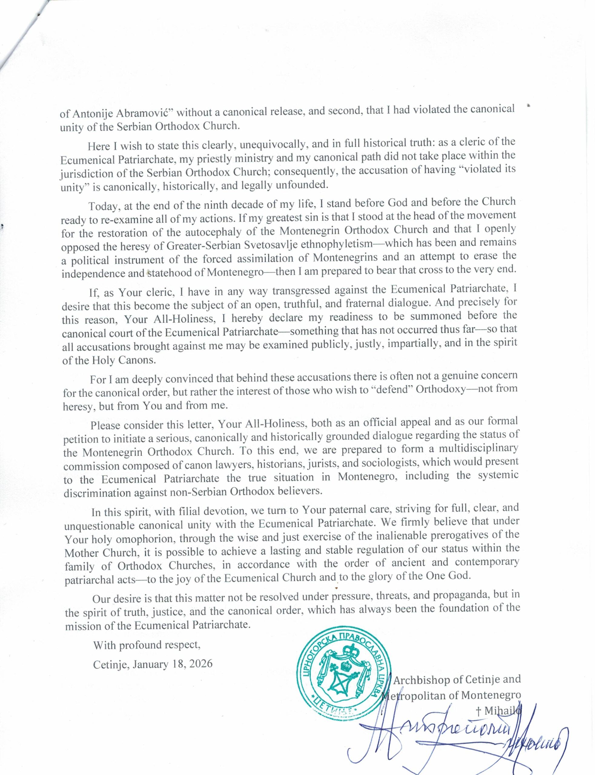 Schizmatický metropolita Černé Hory Michail zaslal oficiální dopis ekumenickému patriarchovi Bartoloměj, v němž žádá o zahájení dialogu a přezkoumání své kanonické kauzy. Dopis, zveřejněný 18. ledna 2026, označuje za výzvu k řešení církevního uspořádání na Balkáně a zároveň upozorňuje na tlak, jemuž má podle autora Ekumenický patriarchát čelit ze strany ruských a srbských mocenských struktur, informuje portál Romfea.