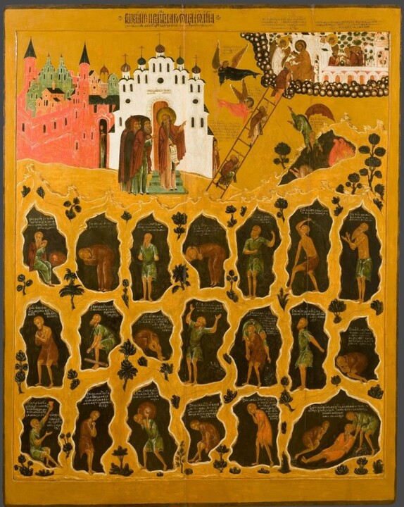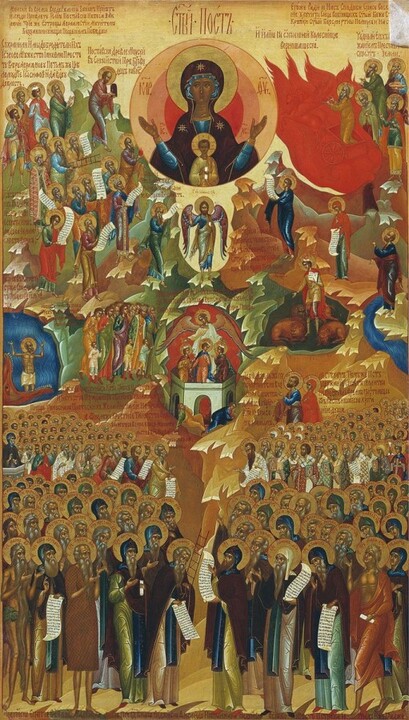 Ruská ikona „Velký post“ (1917): V centrální části je zobrazena Bohorodička „Oranta“ (Znamení) jako symbol Církve, obklopená starozákonními i novozákonními svatými. Autoři této ikony zahynuli jako mučedníci během bolševické revoluce.