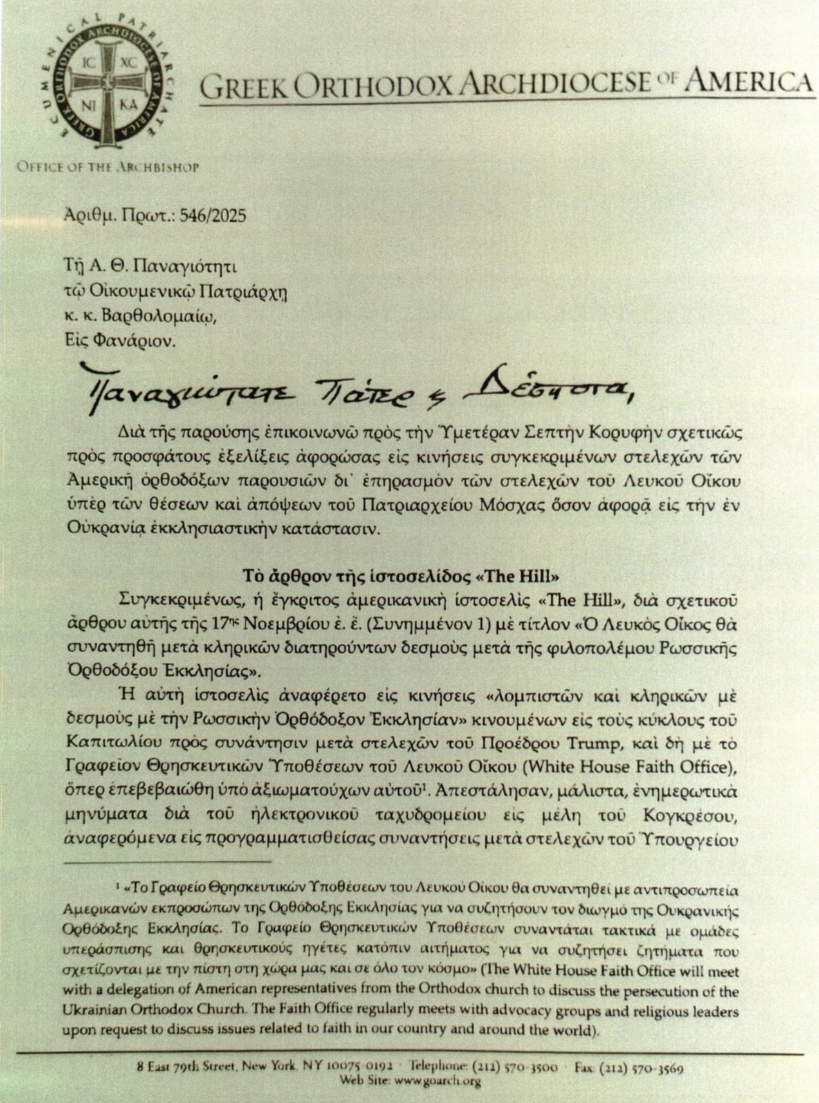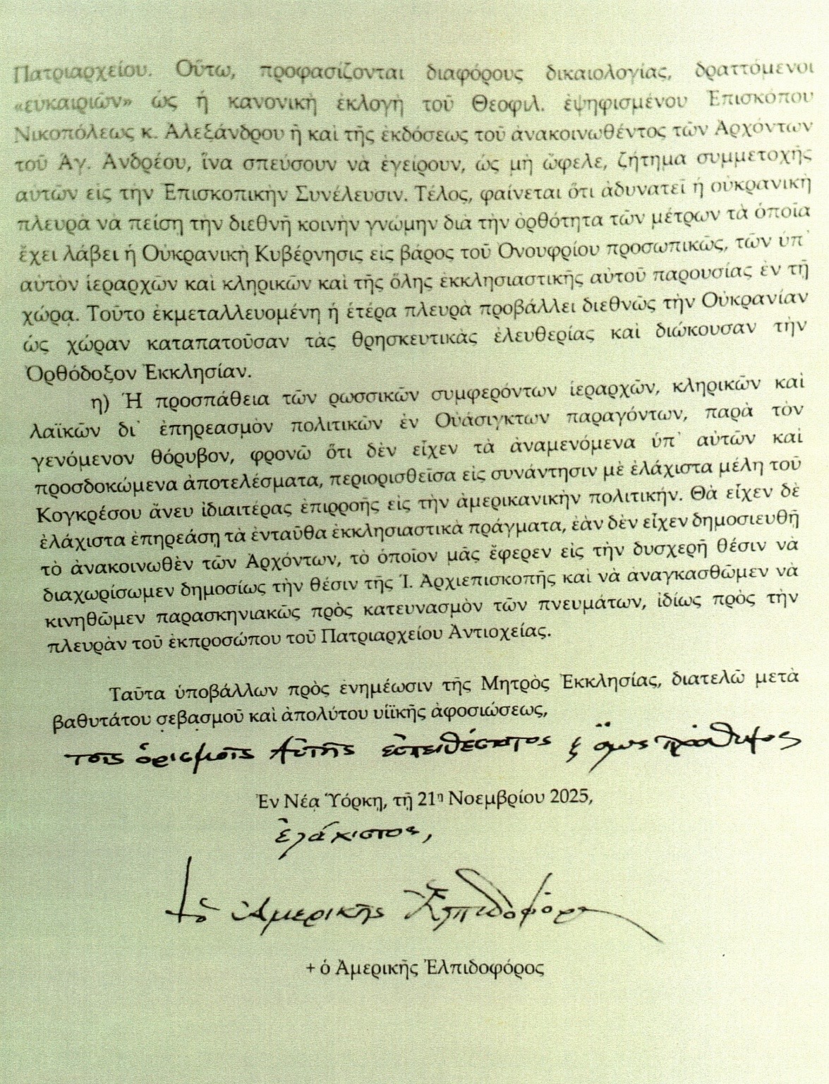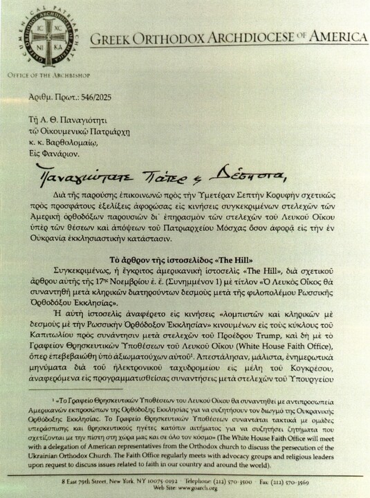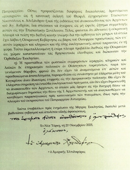 Americká redakce SPN získala mnohastránkový dopis hlavy arcibiskupství Konstantinopolského patriarchátu v USA Elpidofora patriarchovi Bartolomějovi z 21. listopadu 2025. Dopis je napsán řecky a byl redakci předán anonymním zdrojem.