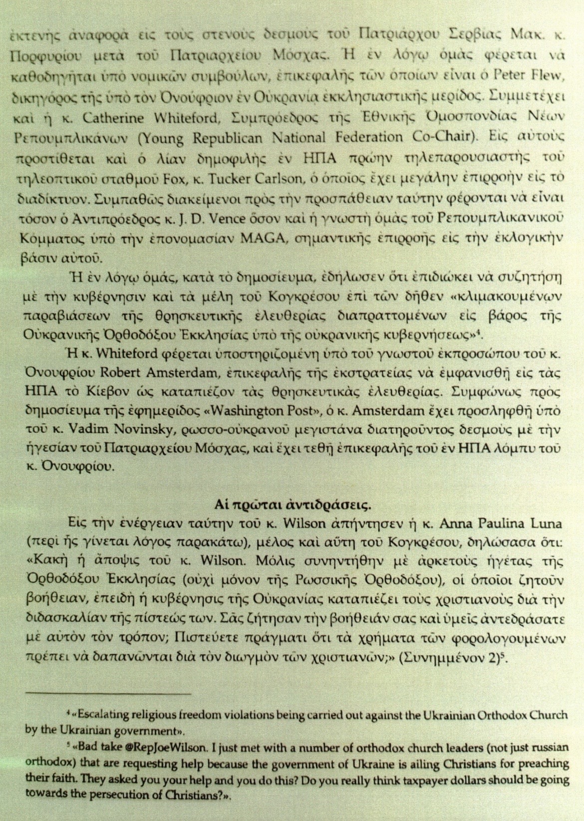 „Nesprávná pozice, @CongressmanJoeWilson. Právě jsem se setkala s několika pravoslavnými církevními představiteli (nejen ruskými), kteří žádají o pomoc, protože ukrajinská vláda pronásleduje křesťany za hlásání jejich víry. Prosili vás o pomoc – a vy takto jednáte? Opravdu si myslíte, že peníze daňových poplatníků mají být používány k pronásledování křesťanů?“