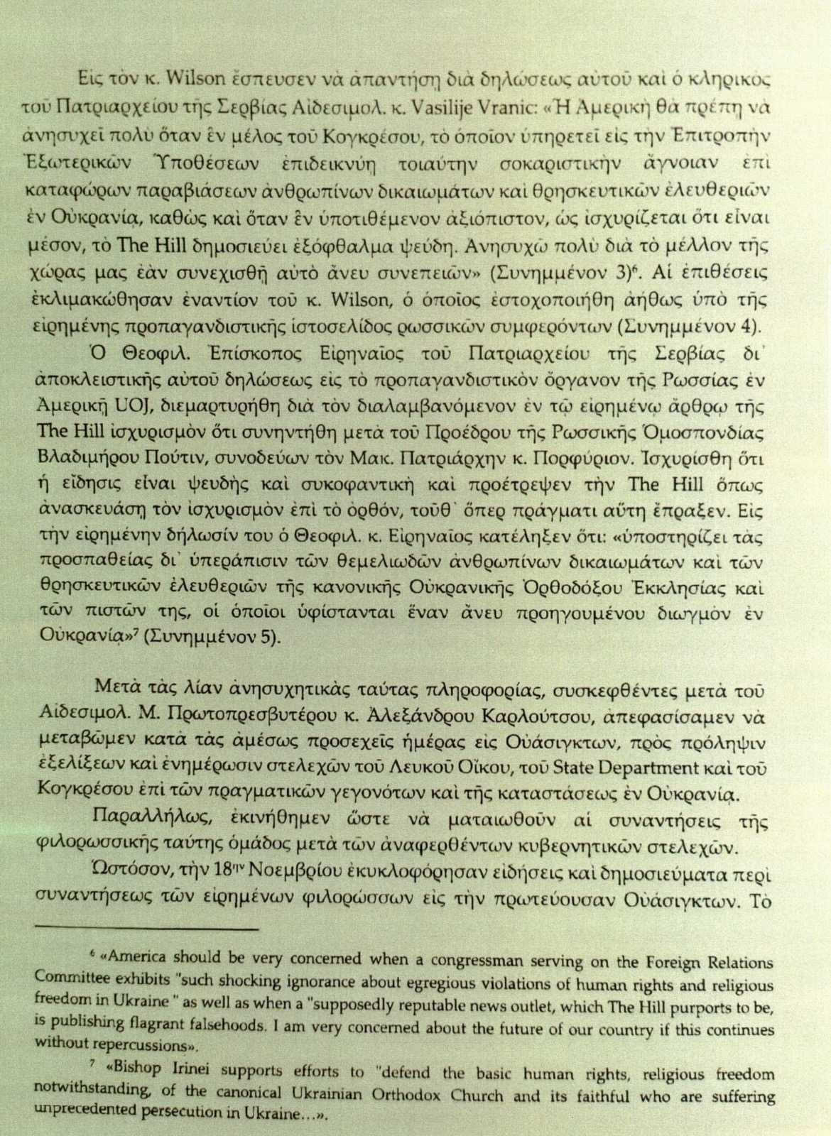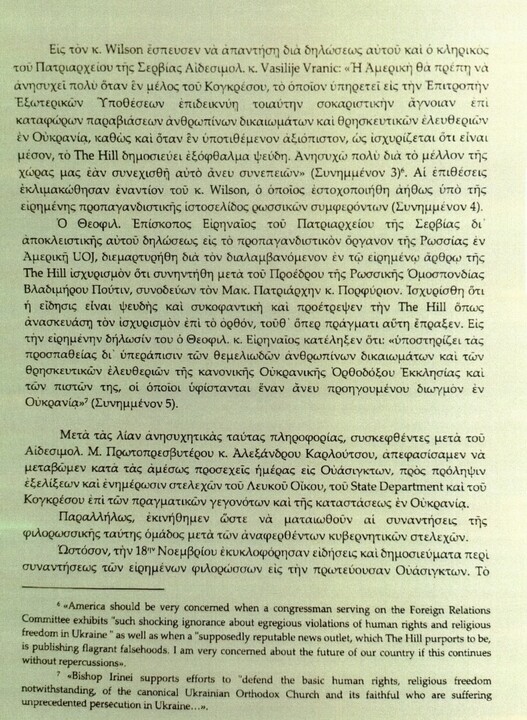 3. Je známo, že Jeho Přeosvícenost biskup Irinej z místní jurisdikce Srbského patriarchátu je v nemilosti své církevní autority, protože je považován za příliš nakloněného Ekumenickému patriarchátu a helénismu. Tím se vysvětluje, že se osobně neúčastnil delegace ve Washingtonu, ale vyslal jednoho ze svých kněží. Pozoruhodné je také jeho označení tvrzení o údajné schůzce s prezidentem Ruska za „pomlouvačnou lež“ – přestože, jak se očekává, v souladu s politikou své církevní autority prohlásil, že „kanonickou“ církví na Ukrajině je církevní struktura vedená Onufrijem.