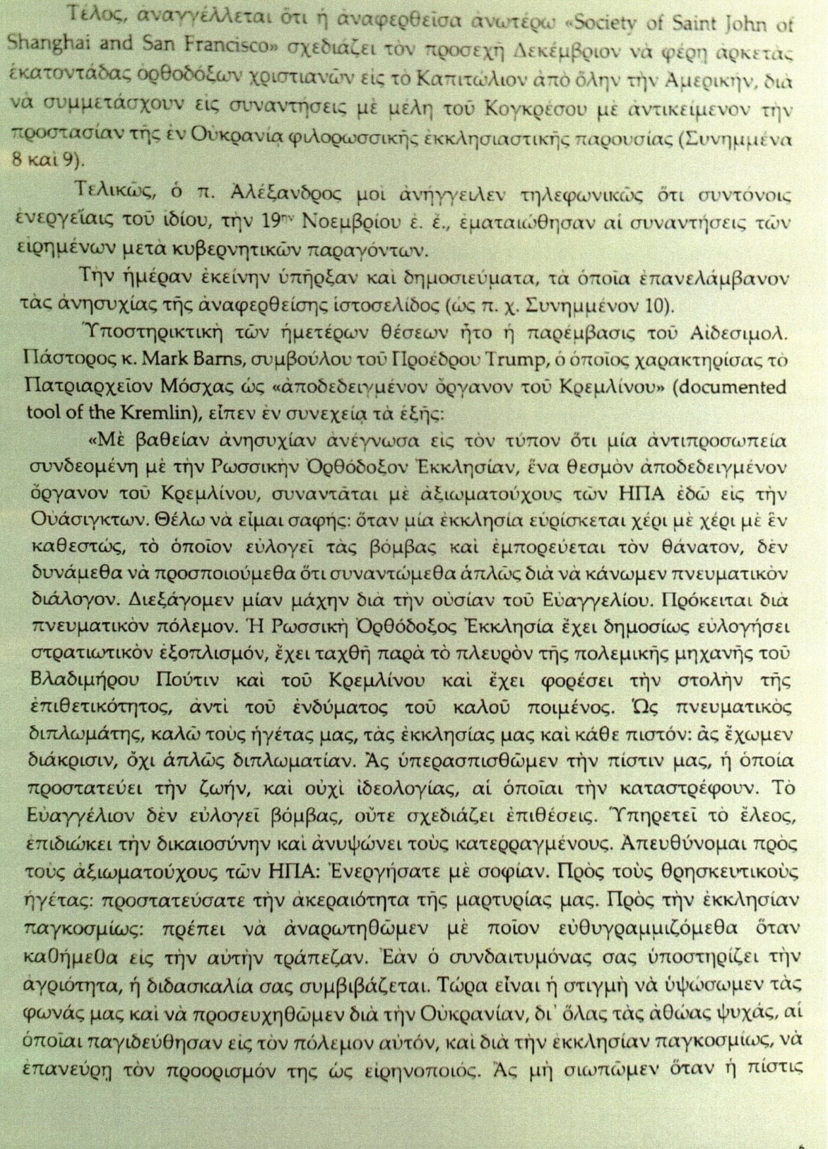 Po těchto velmi znepokojivých zprávách jsme se po poradě s ctihodným Velkým protpresbyterem Alexandrem Karloutsosem rozhodli v nejbližších dnech odcestovat do Washingtonu, abychom zabránili nežádoucímu vývoji událostí a seznámili představitele Bílého domu, ministerstva zahraničí a Kongresu se skutečnými fakty a stavem věcí na Ukrajině.