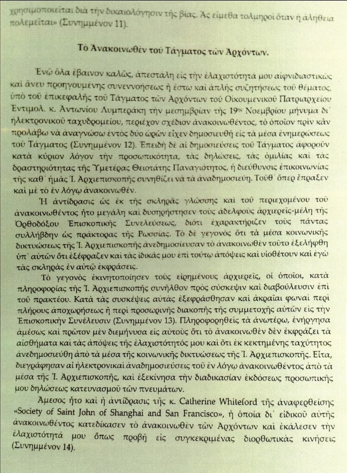 Zatímco se věci vyvíjely příznivě, byl mi bez předchozího souhlasu a dokonce i bez prostého projednání nečekaně zaslán návrh prohlášení – v poledne 19. listopadu e-mailem – od hlavy Řádu archontů Ekumenického patriarchátu, ctihodného pana Anthonyho Limberakise.