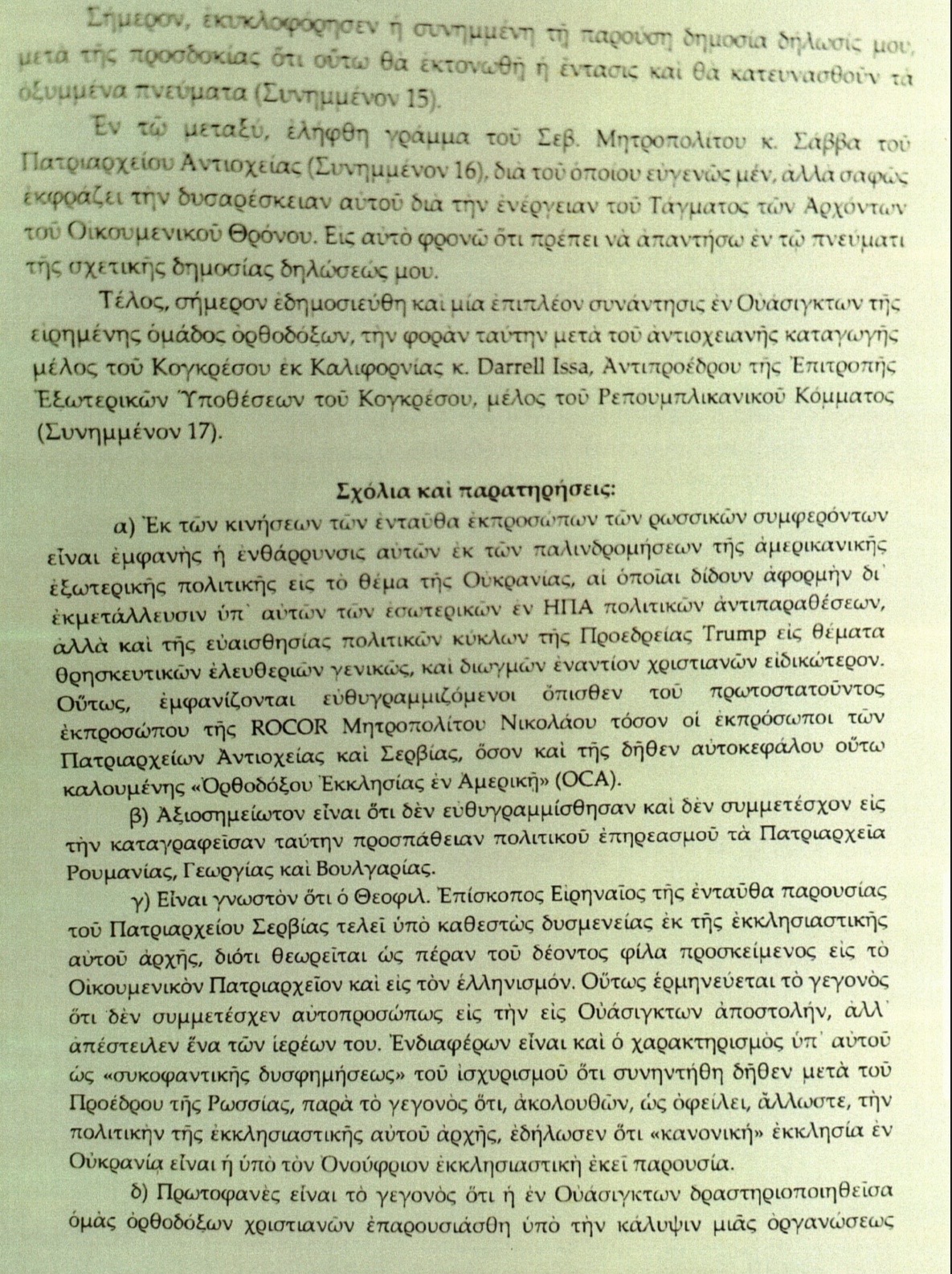 8. Úsilí hierarchů, duchovenstva a laiků zastupujících ruské zájmy o ovlivnění politických aktérů ve Washingtonu – navzdory vzniklému rozruchu – podle mého názoru nepřineslo výsledky, které očekávali a předpokládali. Omezilo se na setkání s velmi malým počtem členů Kongresu, kteří nemají výrazný vliv na americkou politiku. A mělo by minimální dopad na zdejší církevní záležitosti, kdyby nebylo publikováno komuniké Archontů, které nás postavilo do obtížné situace – veřejně vyjádřit postoj Svaté arcidiecéze a přinutilo nás jednat v zákulisí s cílem situaci normalizovat, především pokud jde o zástupce Antiochijského patriarchátu.