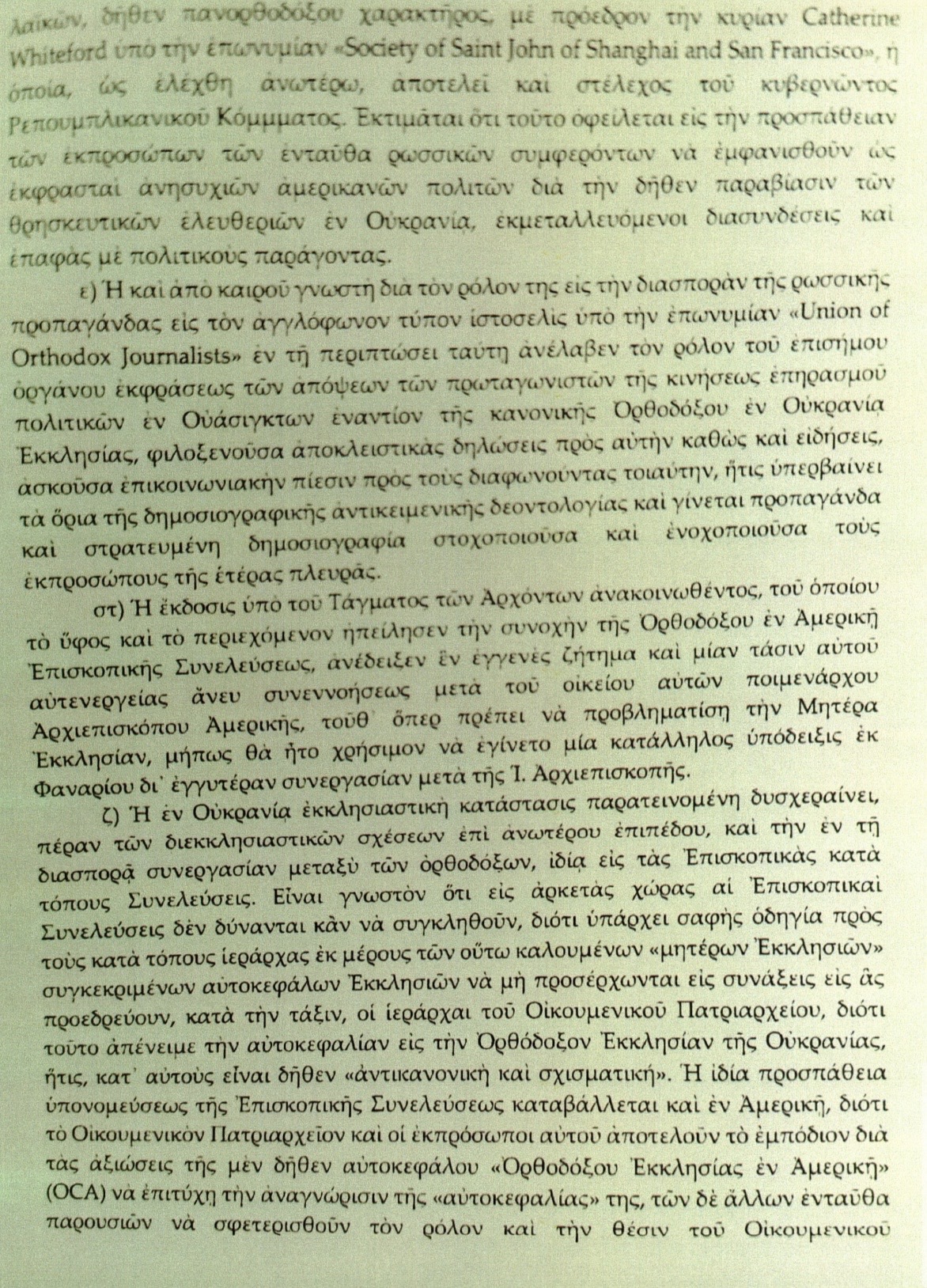 4. Bezprecedentní je skutečnost, že skupina pravoslavných křesťanů působící ve Washingtonu vystoupila pod záštitou světské organizace údajně všepravoslavného charakteru s předsedkyní paní Catherine Whitefordovou pod názvem „Společnost svatého Jana Šanghajského a Sanfranciského“ – tou samou, která, jak bylo uvedeno výše, je funkcionářkou vládnoucí Republikánské strany. Zřejmě se to vysvětluje snahou představitelů ruských zájmů vystupovat jako vyjádření obav amerických občanů z domnělého porušování náboženské svobody na Ukrajině a využívat k tomu vazby a kontakty s politickými aktéry.