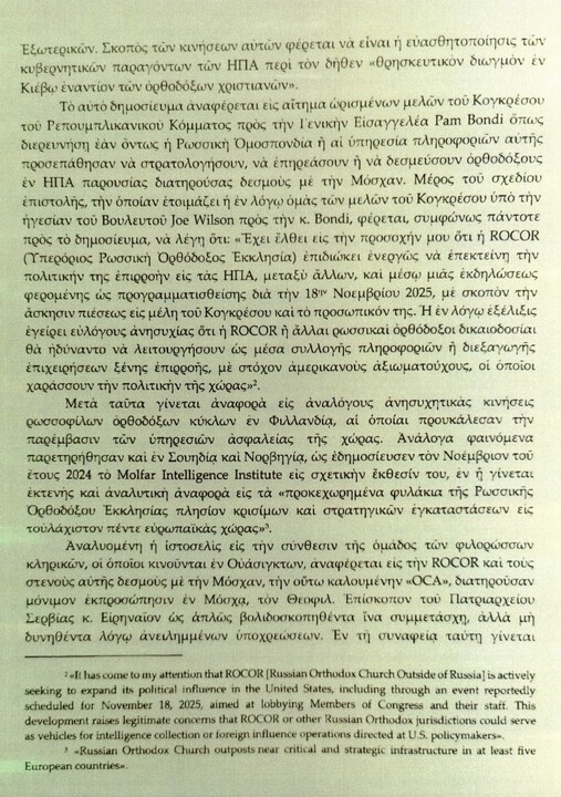 „Bylo mi sděleno, že RPCZ (Ruská pravoslavná církev v zahraničí) se aktivně snaží rozšířit svůj politický vliv ve Spojených státech, včetně prostřednictvím akce údajně plánované na 18. listopadu 2025, která má za cíl lobovat mezi členy Kongresu a jejich zaměstnanci. Tato skutečnost vyvolává oprávněné obavy, že RPCZ nebo jiné pravoslavné jurisdikce Ruské církve mohou být využívány jako nástroje shromažďování zpravodajských informací nebo zahraničních operací vlivu namířených proti americkým politikům.“