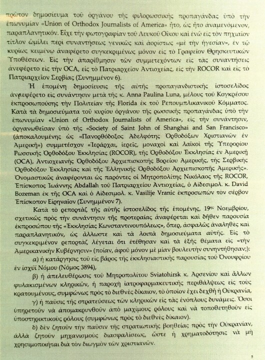 5. Web, který je dlouhodobě znám svou rolí při šíření ruské propagandy v anglickojazyčném tisku pod názvem „Svaz pravoslavných novinářů“, převzal v tomto případě roli oficiálního orgánu vyjadřujícího názory účastníků hnutí usilujícího o ovlivňování politiků ve Washingtonu proti kanonické pravoslavné církvi na Ukrajině. Poskytuje exkluzivní prohlášení a publikuje zprávy, čímž vytváří komunikační tlak na ty, kteří s ním nesouhlasí, což překračuje rámec objektivní novinářské deontologie a mění se v propagandu a militantní žurnalistiku, diskreditující a kriminalizující představitele druhé strany.