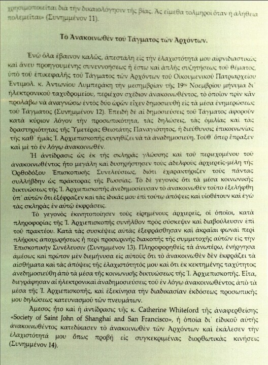Paní Catherine Whiteford ze zmíněné „Společnosti svatého Jana Šanghajského a Sanfranciského“ rovněž vystoupila s prohlášením, v němž odsoudila komuniké Archontů a vyzvala mě, abych přijal nápravná opatření.