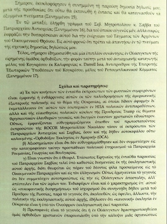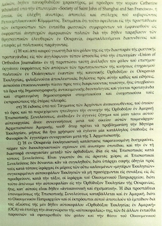 Tímto dopisem se obracím na Vaši ctihodnou hlavu ve věci nedávných událostí souvisejících s činností některých osob z pravoslavných přítomností v Americe, jejichž cílem je ovlivnit představitele Bílého domu ve prospěch postojů a názorů Moskevského patriarchátu ohledně církevní situace na Ukrajině.