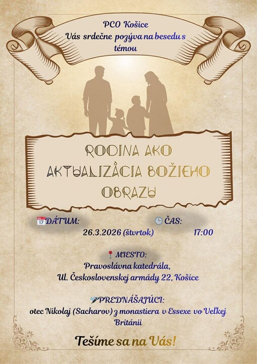 Pravoslavná církevní obec v Košicích srdečně zve věřící i širokou veřejnost na tematickou besedu s názvem „Rodina jako aktualizace Božího obrazu“.