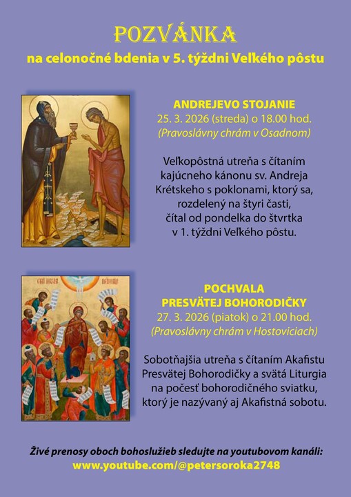 V 5. týždni Veľkého pôstu sa podľa pravoslávnej liturgickej tradície slúžia dve dôležité bohoslužby, na ktoré pozýva duchovný správca Peter Soroka. Prvou z nich je tzv. „Andrejevo stojanie“, ktoré sa uskutoční v stredu 25. marca 2026 o 18:00 hod. v chrámoch vo Varadke (okr. Bardejov) a v Osadnom (okr. Snina). Druhou bohoslužbou je „Pochvala Presvätej Bohorodičky“ (Akafistová sobota), ktorá sa bude slúžiť v piatok 27. marca 2026 o 20:30 hod. vo Varadke a o 21:00 hod. v Hostoviciach. Pre veriacich, ktorí sa nemôžu zúčastniť osobne, sú pripravené živé prenosy z Osadného a Hostovíc na youtubovom kanáli Petra Soroku.