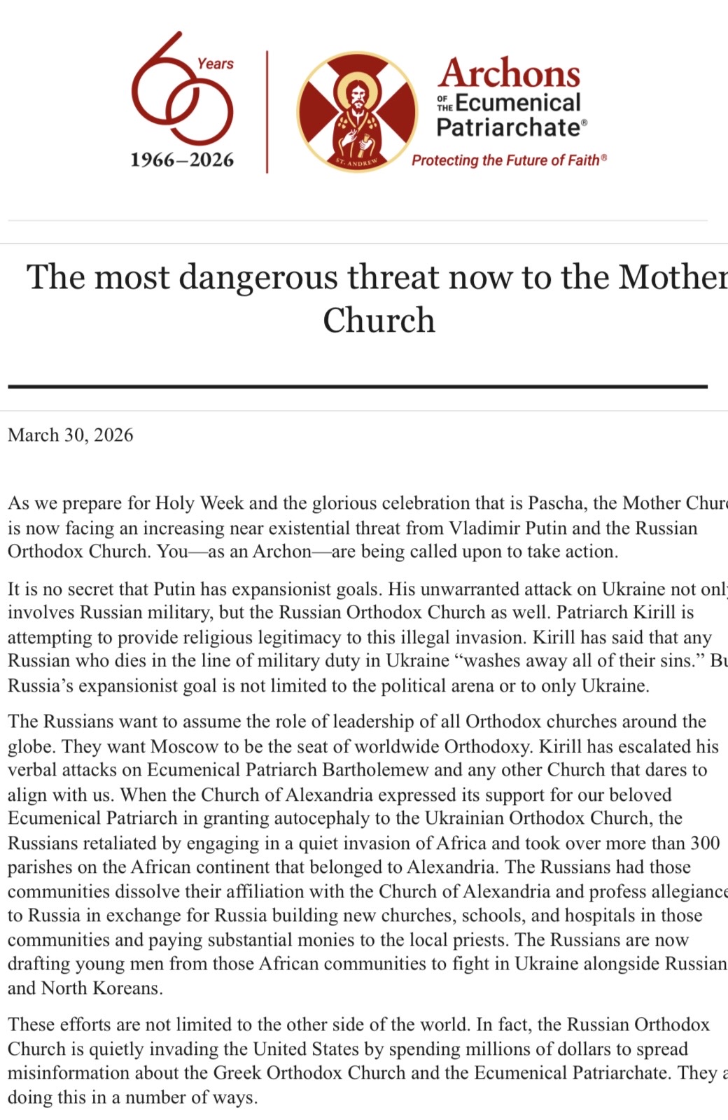 Zatímco se připravujeme na Velký týden a slavné slavení Paschy, Mateřská církev nyní čelí narůstající téměř existenční hrozbě ze strany Vladimira Putina a Ruské pravoslavné církve. Vy – jako archont – jste vyzváni k akci.