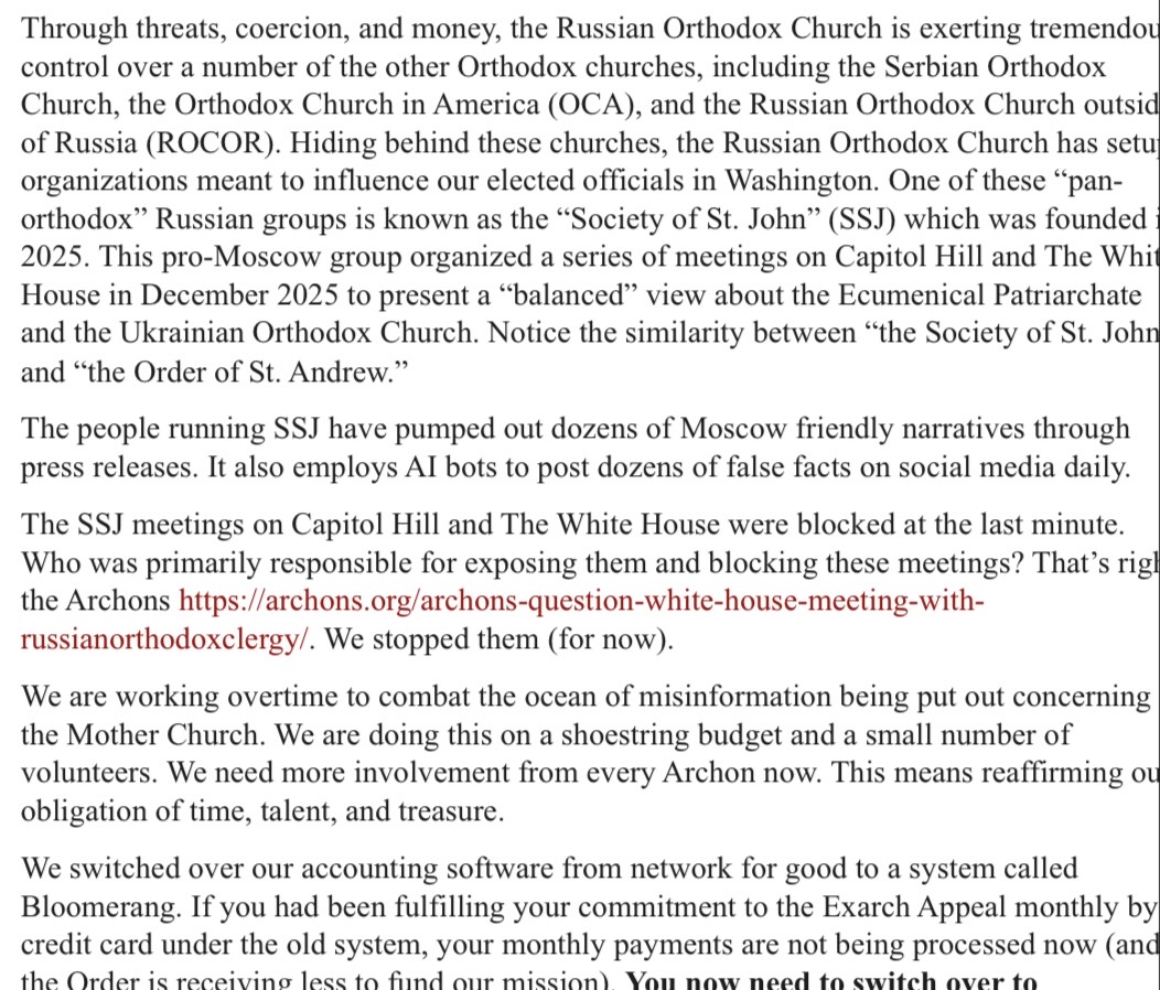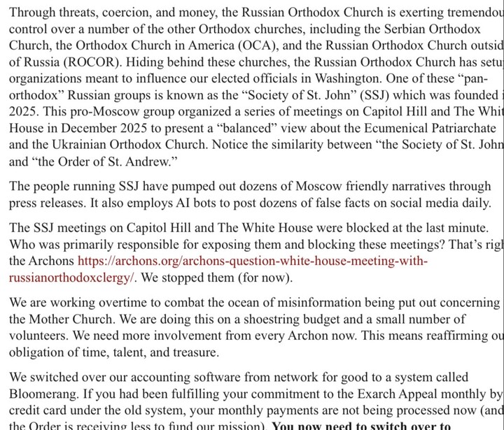 Prostřednictvím hrozeb, nátlaku a peněz Ruská pravoslavná církev uplatňuje obrovskou kontrolu nad řadou dalších pravoslavných církví, včetně Srbské pravoslavné církve, Pravoslavné církve v Americe (OCA) a Ruské pravoslavné církve v zahraničí (ROCOR). Skrývajíc se za těmito církvemi, zřídila organizace určené k ovlivňování našich volených představitelů ve Washingtonu. Jednou z těchto „panpravoslavných“ ruských skupin je tzv. „Společnost sv. Jana“ (SSJ), založená v roce 2025. Tato promoskevská skupina uspořádala v prosinci 2025 sérii setkání na Kapitolu a v Bílém domě, aby představila „vyvážený“ pohled na Ekumenický patriarchát a Ukrajinskou pravoslavnou církev. Všimněte si podobnosti mezi „Společností sv. Jana“ a „Řádem sv. Ondřeje“.