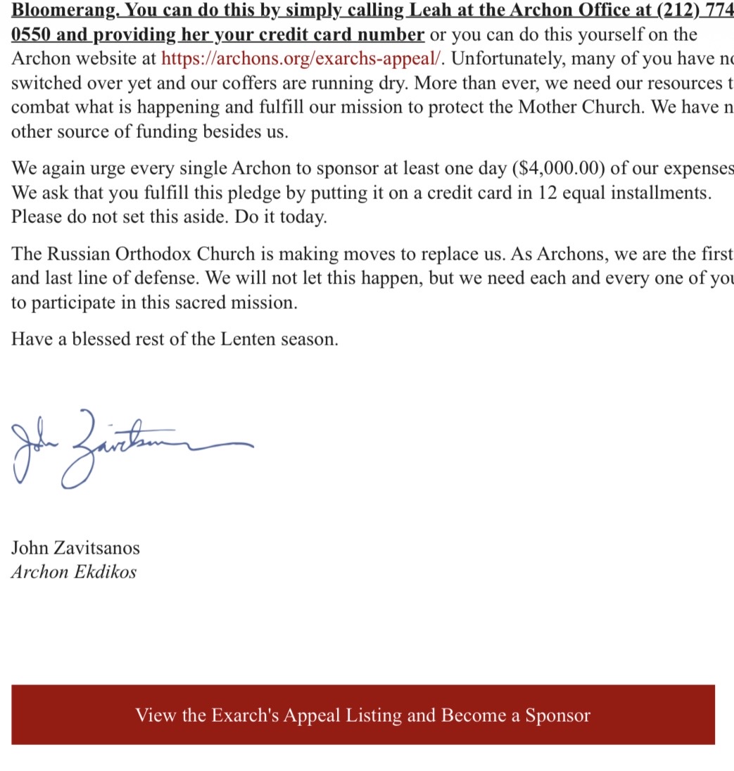 „Pracujeme přesčas, abychom čelili oceánu dezinformací, které jsou šířeny o Mateřské církvi. Děláme to s minimálním rozpočtem a malým počtem dobrovolníků. Nyní potřebujeme větší zapojení každého archonta. To znamená znovu potvrdit náš závazek času, talentu a prostředků… Ruská pravoslavná církev podniká kroky, aby nás nahradila. Jako archonti jsme první a poslední linií obrany. Nedovolíme, aby se to stalo, ale potřebujeme, aby se každý z vás zapojil do této posvátné mise.“