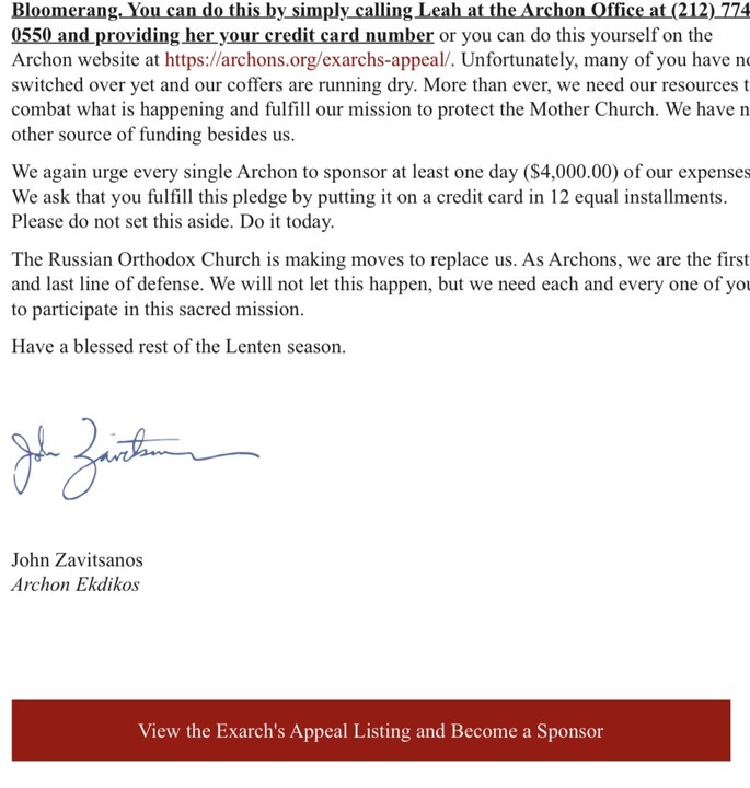E-mail rozeslaný v pondělí ráno, který byl šířen interně a podepsán John Zavitsanos z archontů Ekumenický patriarchát, uvádí, že: