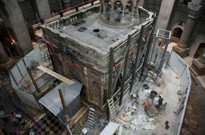 Самая шумная работа – с применением молотков и дрелей – осуществляется по ночам. Фрагменты мраморной облицовки перемещаются в Францисканскую галерею, расположенную под куполом храма Гроба Господня, с помощью специального подъемника.
