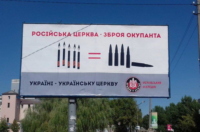 Билборд установило обуховское отделение «Правого Сектора». Он гласил: «Российская Церковь – оружие оккупанта. Украине – украинскую церковь».