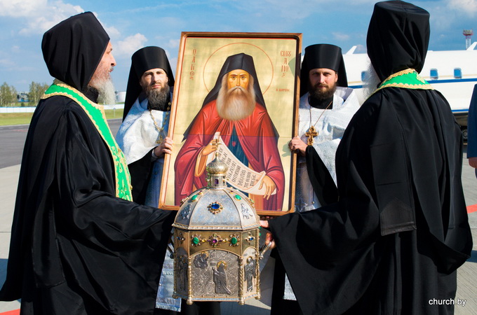 Встречу святыни в Национальном аэропорту «Минск» возглавил епископ Борисовский и Марьиногорский Вениамин. Архиерей совершил молебен в здании аэропорта. По завершении молебна владыка Вениамин обратился к собравшимся с архипастырским словом, в котором напомнил об опыте Богообщения, явленном в житии преподобного Силуана.