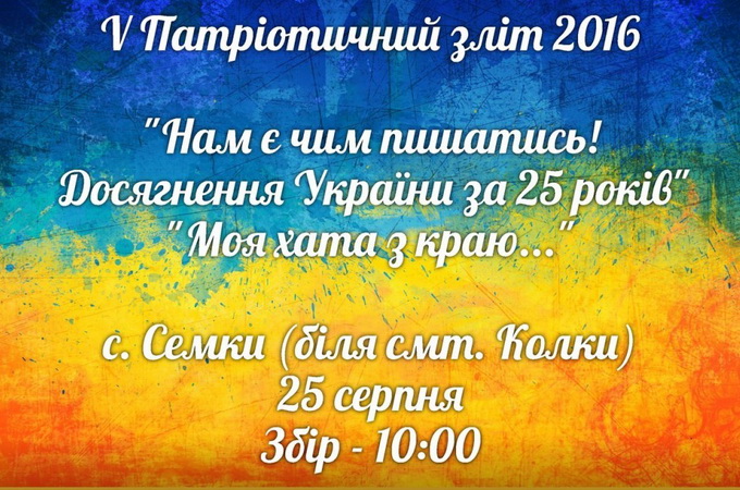 Темой слета будет "Нам есть чем гордиться! Достижения Украины за 25 лет". Подтема – "Моя хата с краю ...". Место проведения – село Семки Маневицкого района.