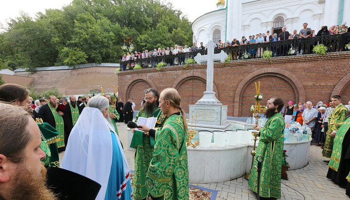 Затем в 7:00 у одного из двух фонтанов, расположенных у подножия Свято-Успенского собора, был отслужен водосвятный молебен преподобному Иоанну Затворнику. Возглавил молебное пение митрополит Святогорский Арсений, владыке наместнику сослужило лаврское духовенство. Призывая Святого Духа на освящающуюся воду, священство и все верующие возносили молитвы ко Иоанну Затворнику, прося его молитвенного предстательства и благодатной помощи.