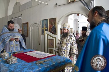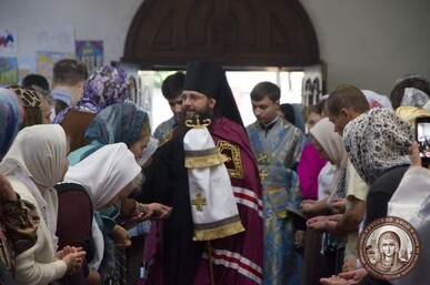 У входа на территорию храма архиерея и гостей приветствовали юные воспитанники детской воскресной школы, действующей при храме. По окончании Литургии был совершен Крестный ход с храмовыми святынями, который завершился молебном у списка Светописанного образа Богородицы, установленного на западном фронтоне храма.