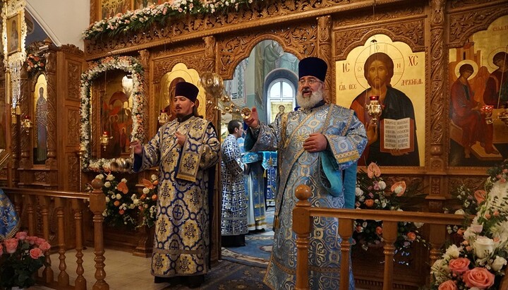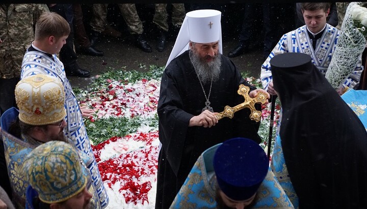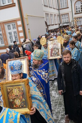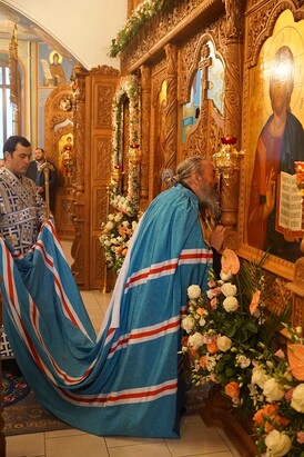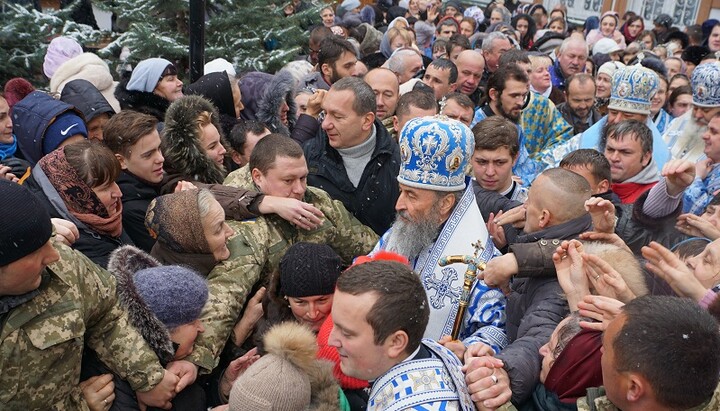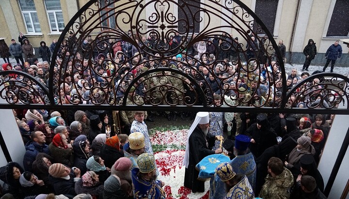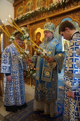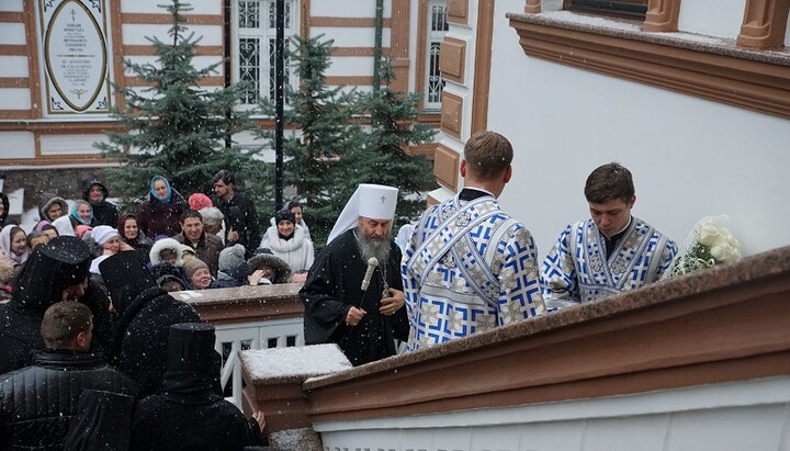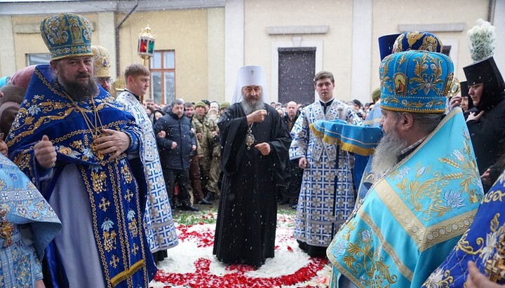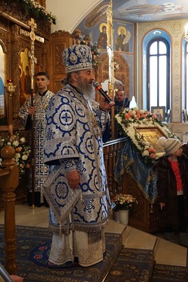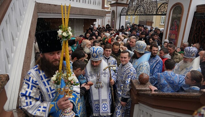 После отпуста Блаженнейший владыка возглавил праздничный молебен и крестный ход, поздравил верующих с праздником, окропил святой водой и благословил всех.