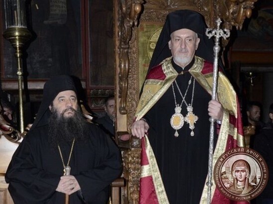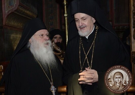 Сразу же после приема состоялись славословия в главном соборе Пантократора, где хранится уникальная чудотворная икона Божией Матери «Геро́нтисса».
