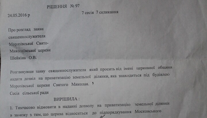 По сообщению источника СПЖ, Морозовский сельсовет долгое время откладывал рассмотрение обращения религиозной общины УПЦ с просьбой разрешить приватизацию земельного участка, на котором находится приходской храм в честь Святого Николая. Священник был вынужден попросить письменное уведомление, что обращение общины попало на рассмотрение сельсовета. После очередной сессии ему выдали решение «временно отказать в предоставлении разрешения на приватизацию земельного участка, в связи с тем, что церковь находится в подчинении Московского патриархата».
