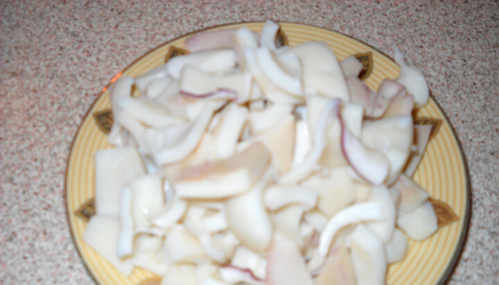 Кальмары очистить от кожуры и внутренностей, опустить в кипящую воду.