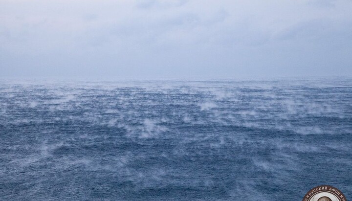 У берегов Афона можно наблюдать удивительную картину, как из неуспевающего остыть моря исходит пар, клубы которого раздувает ветер вдоль морской глади.