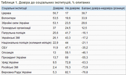 Согласно данным исследований о доверии социальным институтам Украины, в украинском обществе наблюдается тенденция к снижению уровня доверия практически ко всем социальным институтам, кроме Церкви.