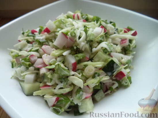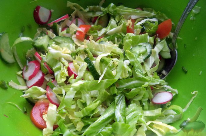 Нарезанный зеленый салат укладывают горкой на середину салатника, а вокруг располагают букетами овощи: нарезанные кружочками огурцы, редис, картофель и морковь, зеленый лук кусочками длиной 1-1,3 см, вареные мелкие соцветия цветной капусты.