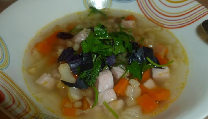 Крупа перловая – 20 г, картофель – 70 г, морковь – 20 г, зелень петрушки – 5 г, соль – 1 г, вода – 400 мл.