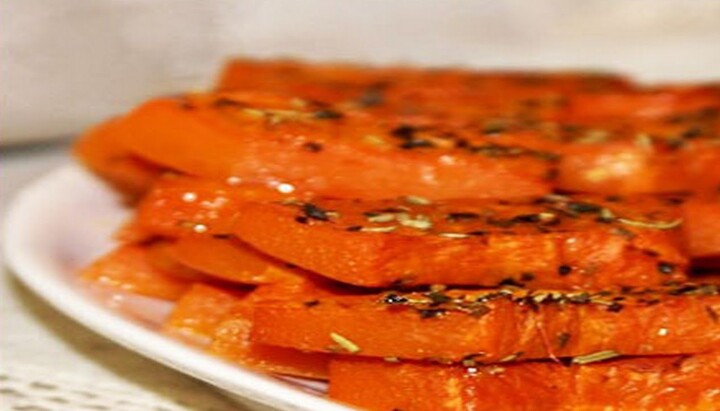 Учитывайте, что ломтики должны быть тонкими – так тыква приготовится быстрее.