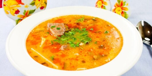 Перед подачей положите в тарелки свежую петрушку и сухарики из черного хлеба.