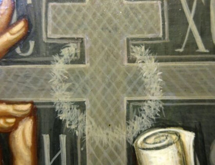 К этому времени на иконе стал проявляться «дефект» – начал проступать некий светлый круг в центре креста на одежде преподобного. Автор иконы предположила, что это проявляется сучок на доске, что было категорически отвергнуто столяром, поскольку сучков на доске не было.