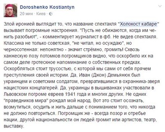 Арт-критик Константин Дорошенко осуждает тех, кто, не видя спектакля, осуждает вывеску: «Злой иронией выглядит то, что название спектакля "Холокост кабаре" вызывает погромные настроения. Пусть не обижаются, когда им че-нить разобьют», – комментирует журналист в соцсети.