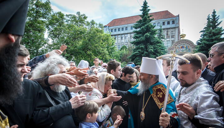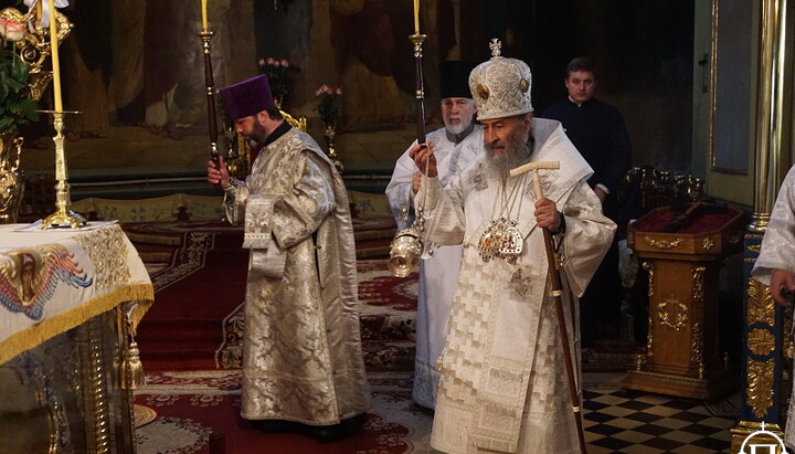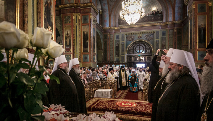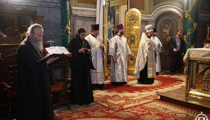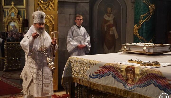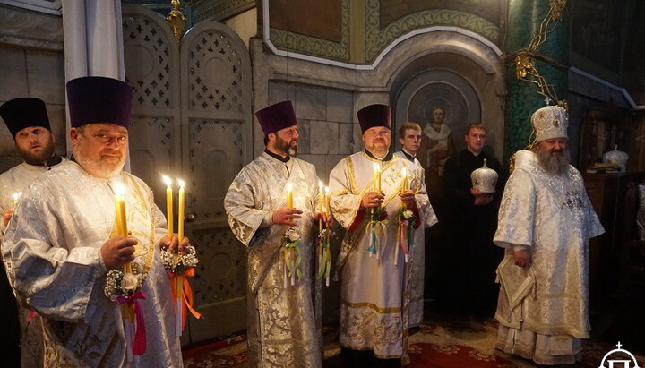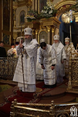 Его Блаженству сослужили митрополит Одесский и Измаильский Агафангел, митрополит Симферопольский и Крымский Лазарь, митрополит Донецкий и Мариупольский Иларион, митрополит Каменец-Подольский и Городокский Феодор, митрополит Вышгородский и Чернобыльский Павел, митрополит Луганский и Алчевский Митрофан, митрополит Днепропетровский и Павлоградский Ириней, митрополит Тернопольский и Кременецкий Сергий, митрополит Николаевский и Очаковский Питирим, митрополит Харьковский и Богодуховский Онуфрий, архиепископ Изюмский и Купянский Елисей, архиепископ Ровеньковский и Свердловский Пантелеимон, архиепископ Новомосковский Евлогий, епископ Кременчугский и Лубенский Николай, епископ Южненский Диодор, а также духовенство Харьковской епархии.