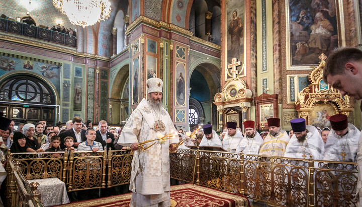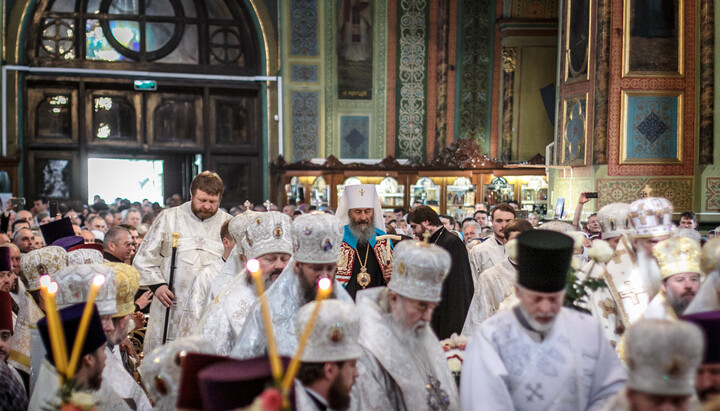 По завершению Литургии митрополит Агафангел зачитал приветственное слово Блаженнейшему Митрополиту Онуфрия от Священного Синода УПЦ, а также вручил Предстоятелю грамоту и орден преподобного Иова I степени.