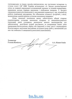 Ответ за подписью Председателя Комитета ВР Андрея Кожемякина был подготовлен по результатам рассмотрения обращения пастырского совета при Государственной пенитенциарной службе Украины.